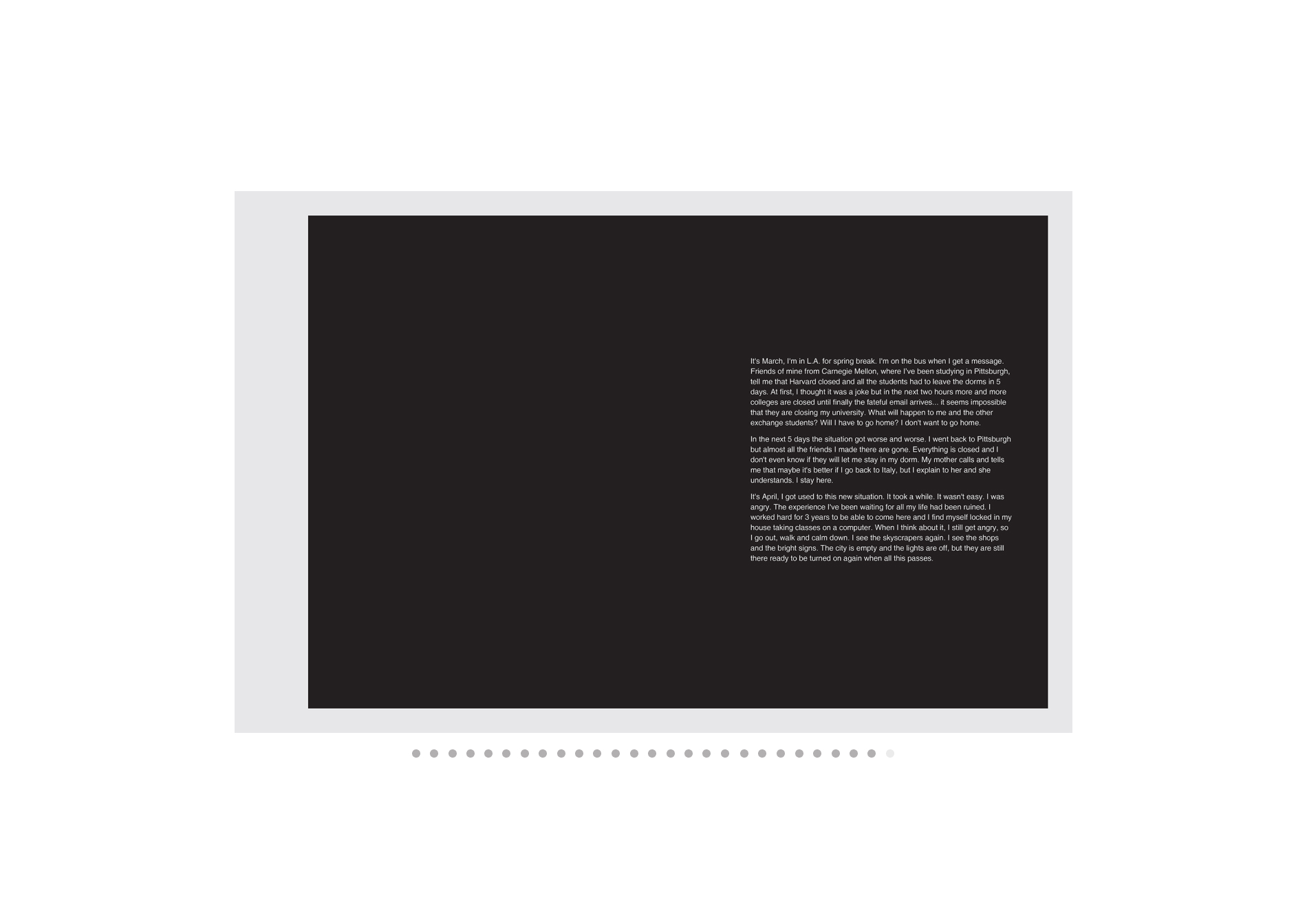 Telling a story through a photograph collection is not easy but it is the only way to describe oneself on a global level, it is the only tool that does not encounter language or educational obstacles. Through this small photographic collection, I have tried to represent a part of the most important experience of my life and how it has been totally changed because of the beginning of the covid-19 pandemic. The aim of the project is therefore to transmit a part of my experience to the viewer, trying to make them understand the emotions I felt during that period.