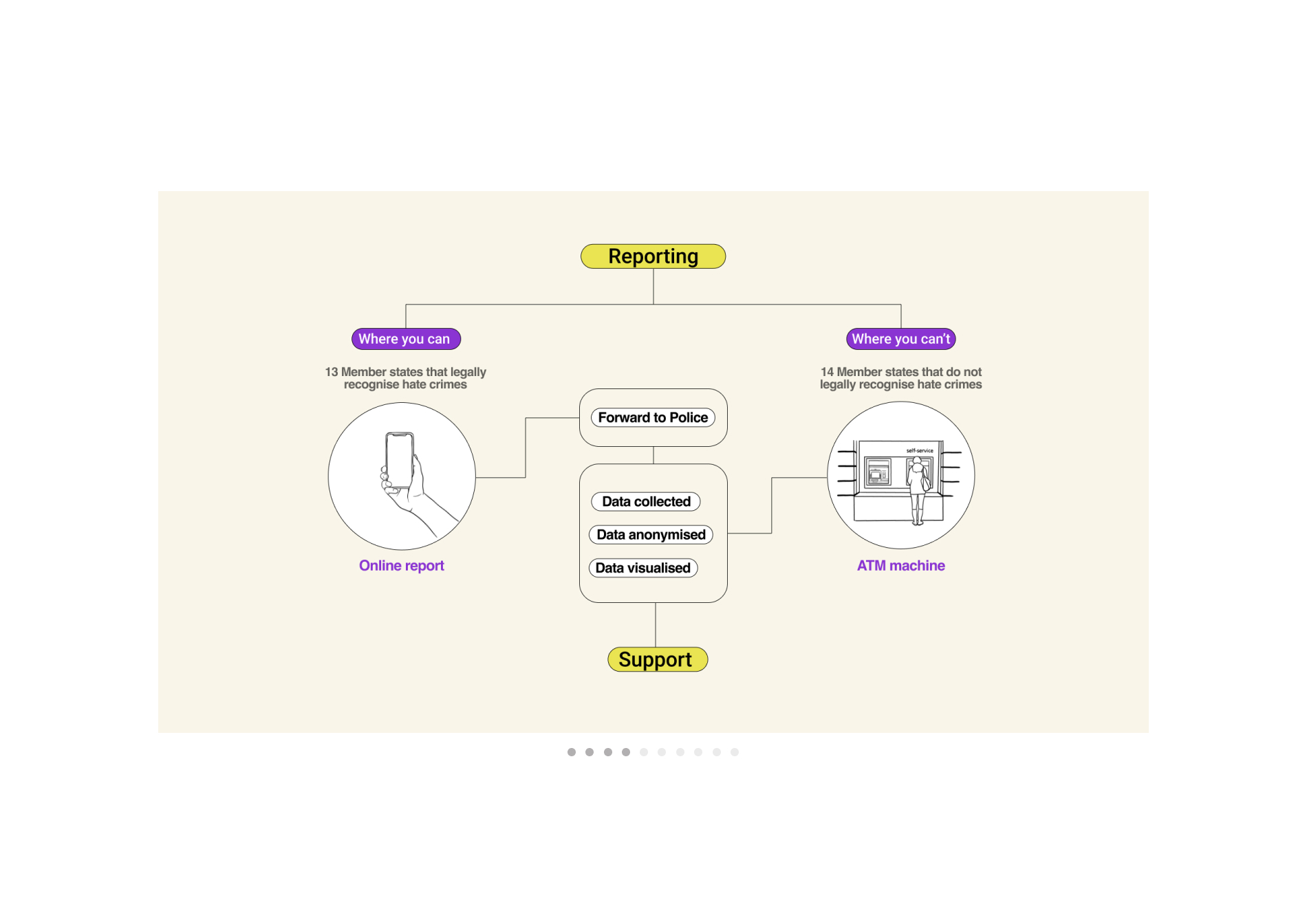 Orbit can really facilitate the process of reporting. In the countries where hate crimes are legally recognized, individuals can quickly report online, from the comfort of their homes, without having to face the stress and the fear of going to the police station. Their reports, in fact, are forwarded to the police and all the data collected are anonymously showed on an open source digital platform, which aims to show a clear picture of the current situation. On this platform numerous support services are available to help people who suffer a hate crime. In the 14 countries where, shamefully, hate crimes against the LGBT Community are still not recognized from the institutions, Orbit goal is to collect trustable data to show the severity of the problem and to hopefully achieve a change of policy. In these countries the barriers are even more and to normalize the act of report and make individuals more confident in the anonymity of the process, Orbit employs existing touchpoint, trustable and available everywhere, ATM machines.